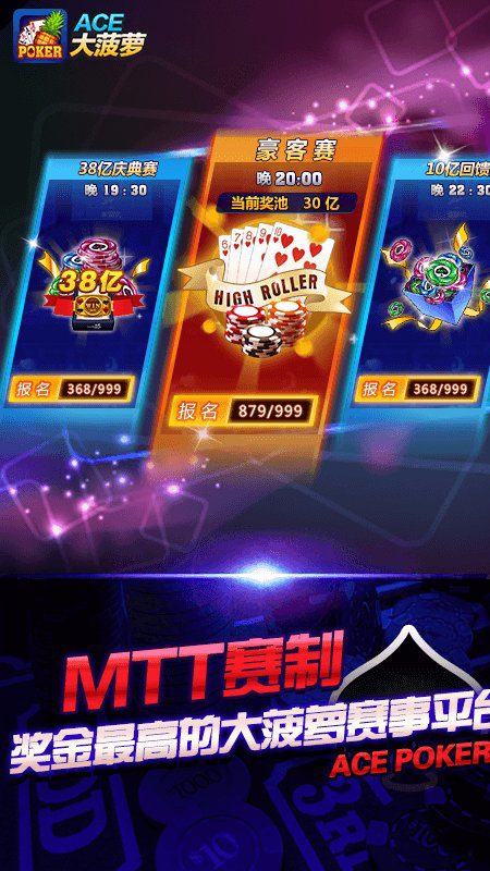 《ACE大菠萝》是目前国内在线人数、比赛类型、数量超级丰富、保证金极高的大菠萝游戏。ACE大菠萝是德州扑克的变种玩法,更易上手,娱乐性,竞技性更强,该玩法已经成为世界扑克大赛WSOP新晋项目。