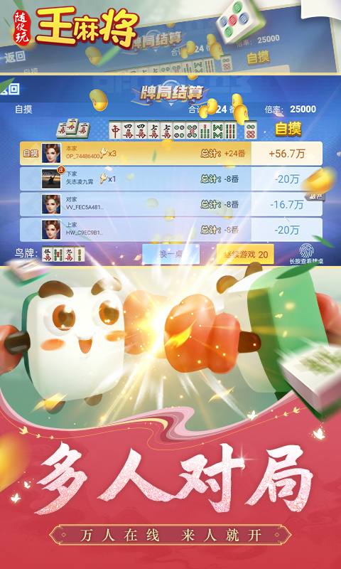 今年最火爆、最流行的麻将全集游戏!包含全国各地最热门玩法:血流成河、血战到底、国标麻将、广东麻将、二人麻将、大众麻将、卡五星麻将、红中麻将、长沙麻将、捉鸡麻将、陕西麻将等一系列经典玩法! 1.智能选牌,简单便捷。 2.快速游戏:独特玩家撮合机制,万人在线,随时随地匹配游戏 3.真实的玩牌体验,考验技术与配合的技巧 4.省电省流量:全面优化,省钱省心省流量 5.超大牌面:粗指头姑娘、汉子也不怕点错牌 6.精美画面:打牌也要视觉享受 7.特色音效:诙谐有趣,只求博您一笑...展开收起