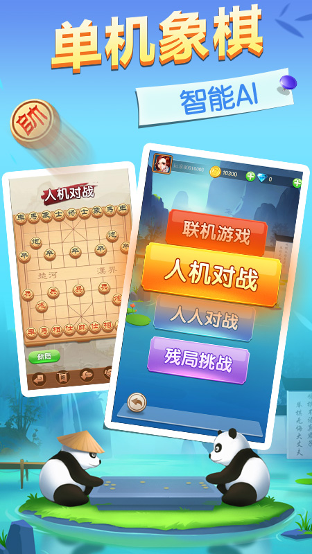 【联机对战】真人对战,快速匹配。与卧虎藏龙的高手切磋,在棋牌上运筹帷幄,决胜千里。 【双人对战】空闲之余,可以和你的好朋友同台竞技,一较高下。 【残局挑战】超多的杀法大全、象棋名谱,助你提升棋艺。 【真人配音】音乐动听,真人配音,身临其境的下棋体验! 【界面清新】简约清新的对局画面,功能简洁,一目了然!