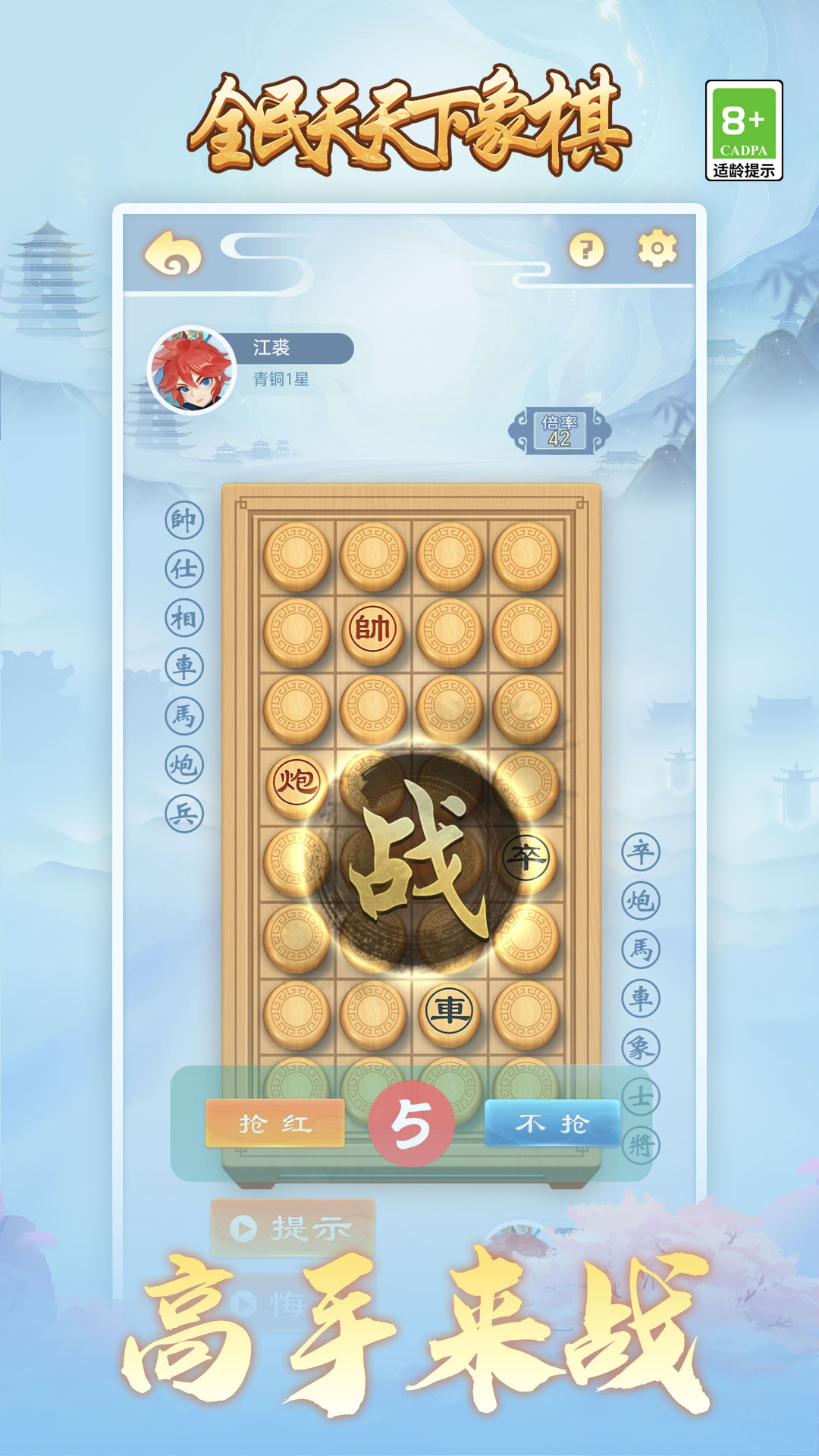 《全民天天下象棋》是一款画风清新脱俗的单机象棋游戏,集合了传统象棋、揭棋和翻棋三种经典玩法。不论你是象棋新手还是高手,都能在这里找到对战乐趣。游戏无需联网,随时随地畅玩,智能对战陪你切磋棋艺,提升技巧。快来挑战自我,感受象棋的无限魅力吧!