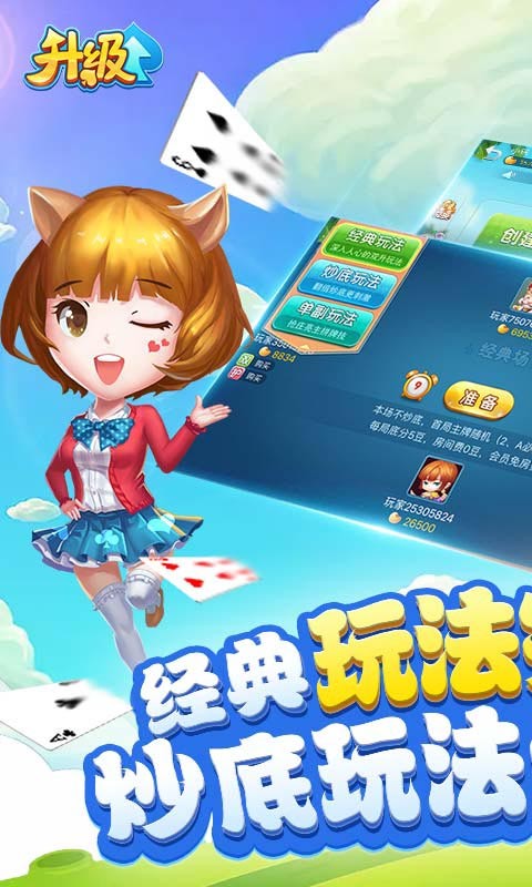 全民特色经典游戏“升级”上线了,多乐够级、多乐保皇团队精品续作。 升级游戏,又叫做双升、双扣、拖拉机或80分(八十分)。升级手机端下载、无需注册、安装后即可立即游戏,无需担心人手不够,一人也能畅快打双升。