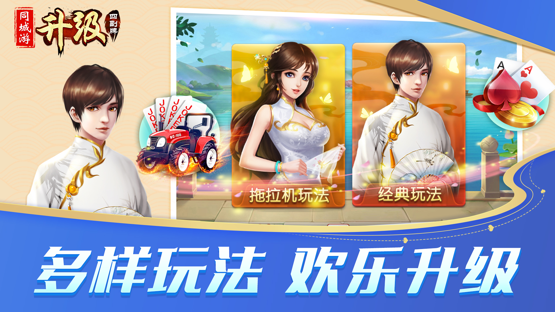 同城游四副牌升级还包含独有的四副拖拉机玩法,四副拖拉机比普通拖拉机、80分更刺激,更考验牌技!