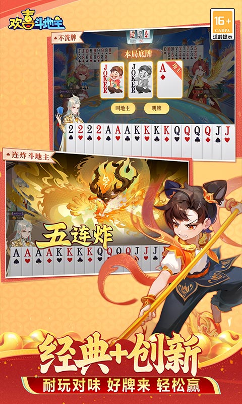 经典三人,欢喜四人,天地癞子场,炸蛋场,2v2组队,玩法应有尽有! 抢地主、明牌、最后一手牌、提前看底牌等功能助你疯狂加倍,刺激牌局任你选!...展开收起