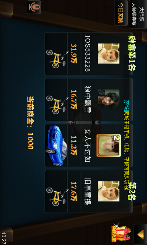 同城乐吉安麻将是地道的吉安本地麻将打法,将吉安麻将地道的“正副精”、“上下翻精”、“冲关”、“霸王精”、“杠精”、“精还原”、“精钓”、“德国”、“德中德”等打法都一一体现。同城乐吉安麻将采用的是3D场景技术,是目前用户体验感舒服的棋牌手游!同时同城乐吉安麻将还支持互联,无论您是手机、电脑、平板电脑,都可以和朋友同时在线玩地道的吉安麻将。