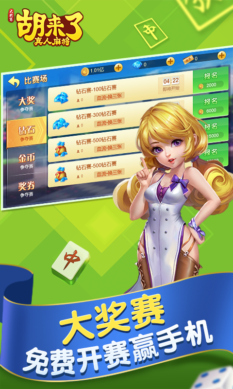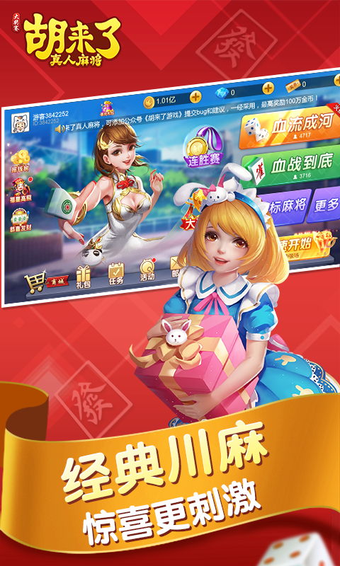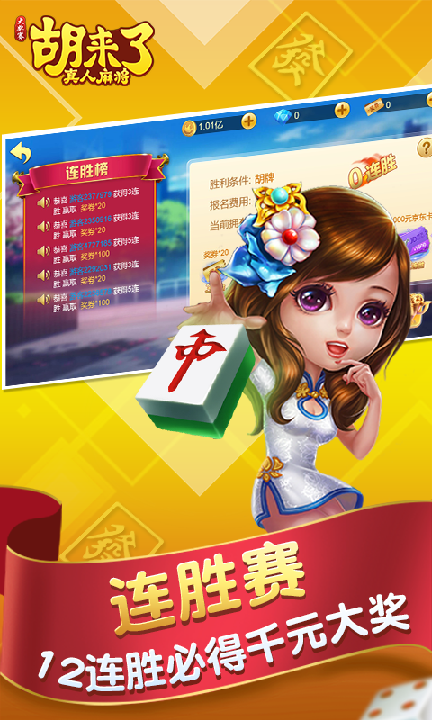 《胡来了真人麻将》最爽快的在线真人麻将。极限挑战赢千元现金大奖,免费福利赛手机、红包、话费送不停,疯狂血流、血战玩牌就能拿红包。