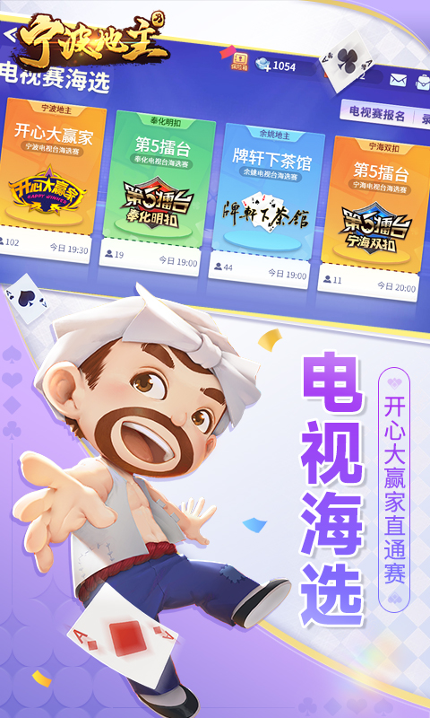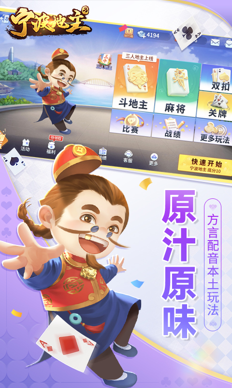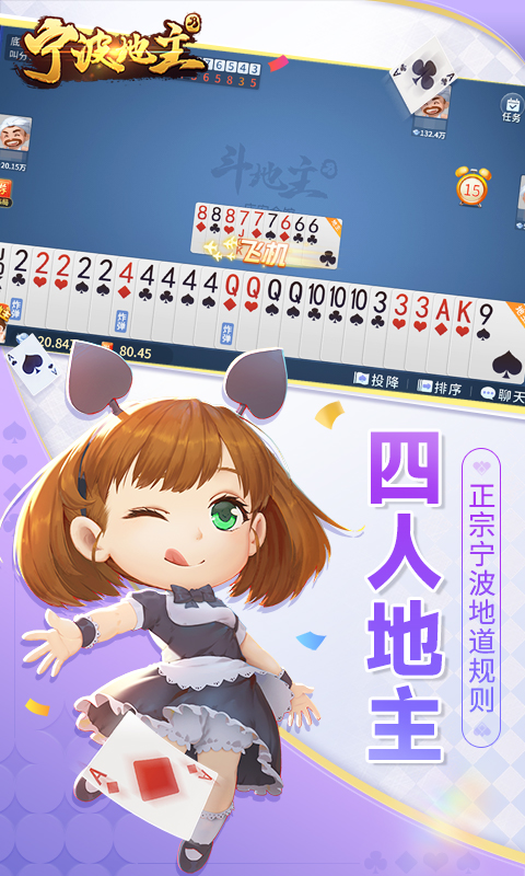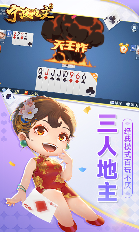 百万牌友在线匹配, 银子福利天天领好玩不花钱! 地道四人斗地主, 满手炸弹大小王当赖子打得痛快! 各种比赛秀出牌技, 还有机会参加电视台栏目赢大奖! 各种配音版本任您选择, 还有地道宁波各地方言出牌也有家乡味!