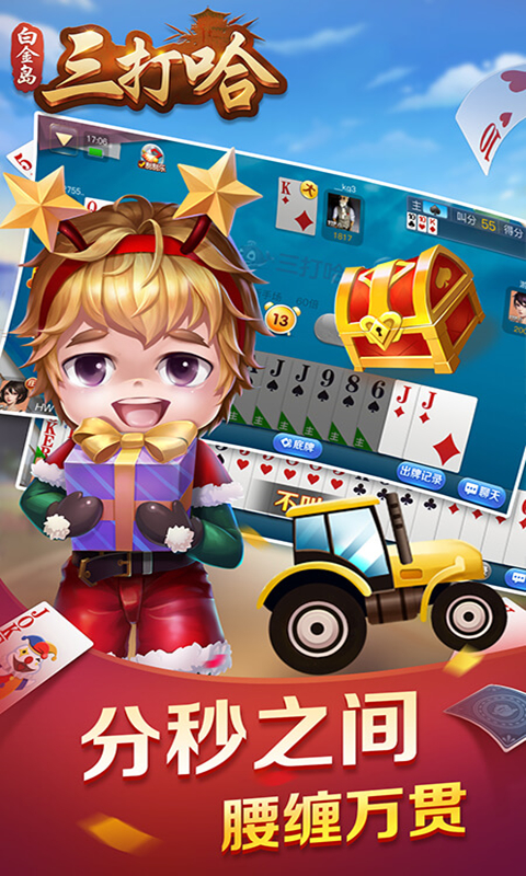 【游戏简介】 三打哈玩法起源于湖南,使用两副牌的3v1的四人游戏,三人合作对抗庄家,玩法与升级相似且游戏性更强,更考验玩家之间配合技巧,乐趣多多。有的地方叫“三打一”,其打法类似升级,在江西叫二七王(27王)【热门活动】 免费下载,免费约局,万人同时在线,超多大奖活动! 每日幸运签到,福利奖品趣多多!【多种玩法】 三打哈+湘潭三打哈+衡阳三打哈+二七王+拖拉机,感受不同玩法的魅力!【真人竞技】 竞技场与朋友桌,真人联网竞技,实时比拼大脑!【私人订制】 高级头像框及称号让对手见面胆寒,竞技王者舍我其谁!【精美画面】 细腻精美的画面,视觉盛宴,炫酷的牌型动画,增加更多游戏乐趣!特别设计大牌画面,方便手机操作!...展开收起