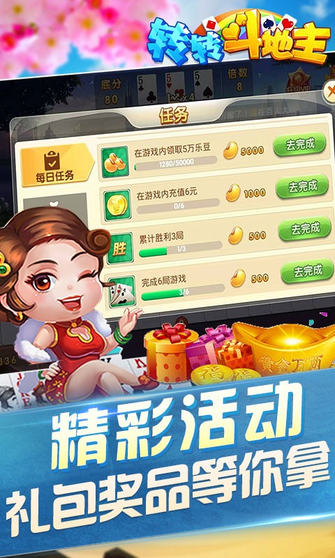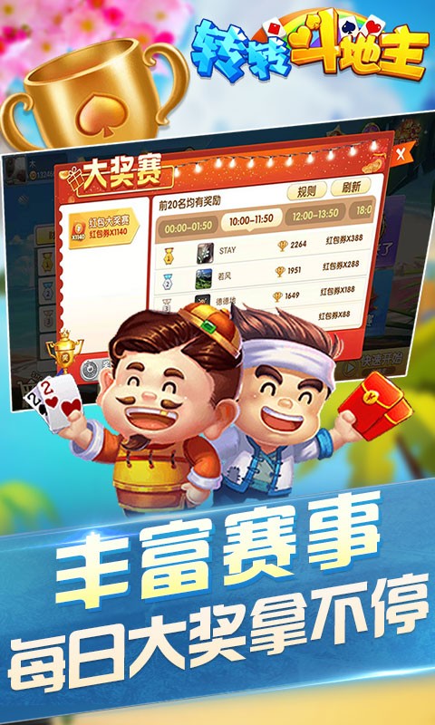 转转斗地主 四大游戏特色邀您体验 【万人在线 随时开战】万人实时在线,真人开战,随时一起来畅玩! 【画面精致 玩法丰富】高清的画面,好听的背景音乐,丰富的人物形象,经典、不洗牌等玩法任您挑选! 【丰富赛事 丰厚奖品】丰富的大奖赛模式,全天赛事不停,更有海量大奖等你来拿! 【独特玩法 红包不停】每日登录领红包,打牌实力得红包,幸运抽奖赚红包,每天送出万元红包! 转转斗地主吸取市面欢乐斗地主、jj斗地主、天天斗地主、途游斗地主等斗地主精华,打造全新精彩斗地主,让你好玩更过瘾。玩 家赢牌后可选择赢取红包券或玩豆,兑换海量奖品。 转转斗地主是一款精心打造的卡通风休闲斗地主游戏。 斗地主游戏中最少由3个玩家进行,用一副54张牌(连鬼牌),其中一方为地主,其余两家为另一方农民,双方对战,先出完牌的 一方获胜。...展开收起
