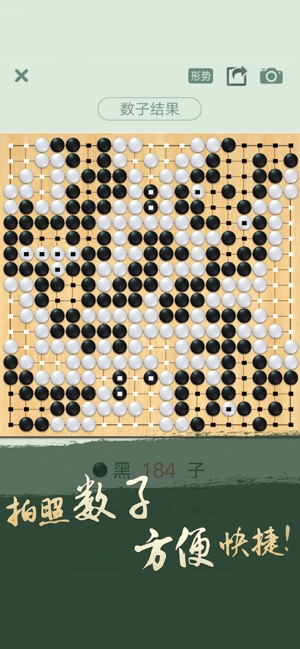腾讯围棋还为线下棋迷提供拍照数子功能,手机一拍,即可获得棋局精确胜负结果!即使棋局未结束,也可识别出形势判断结果。...展开收起