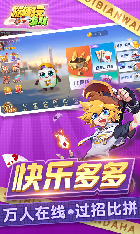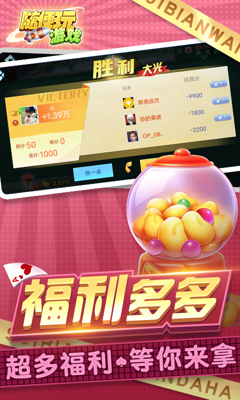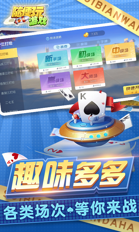 打比赛赢大奖啰,开学送福利。 全新界面,刺激风趣嗨翻天。 丰富福利活动,玩家互动更过瘾。 精彩赛事升级,来玩比赛场赢取豪礼吧~ 地道三打哈,刺激风趣过瘾! 湖南三打一,江西二七王。 万人在线,随时随地随便玩! 免费下载,超多活动送奖品!