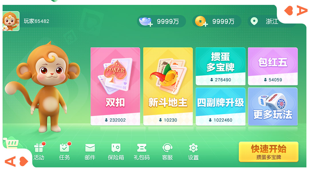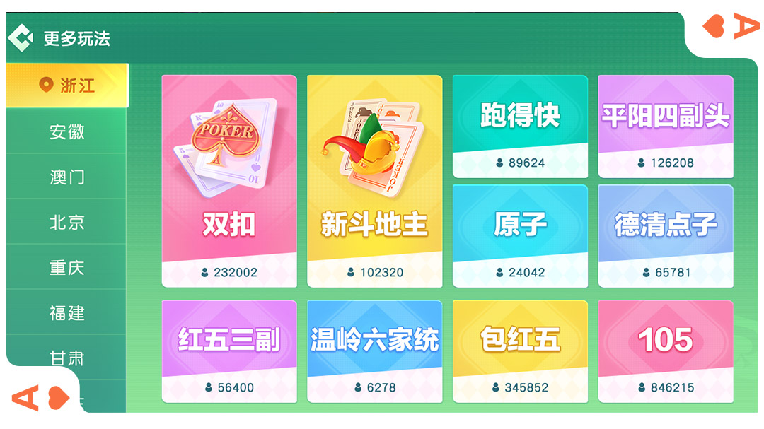 当前已经覆盖浙江、安徽、江苏、山东等省份的扑克麻将玩法。