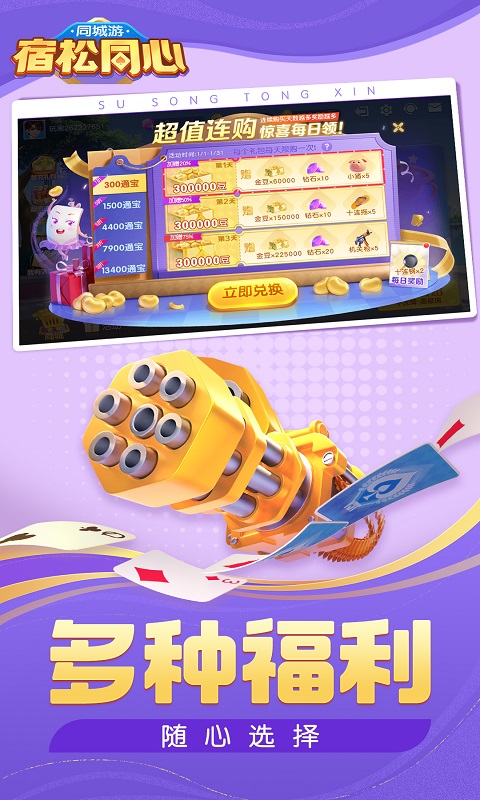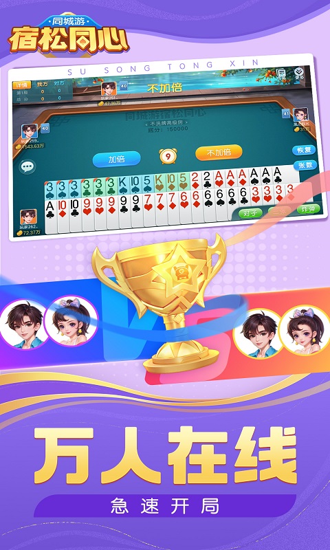 同城游宿松同心保留原汁原味宿松规则,包含不洗牌经典双玩法,对抗强、玩法灵活多变,规矩严谨。 【游戏特色】 1.方言配音,超美界面! 2.真人对抗,公平公正! 3.一键配桌,智能出牌! 4.任务多样,任君挑战! 5.画风精美,运行流畅!