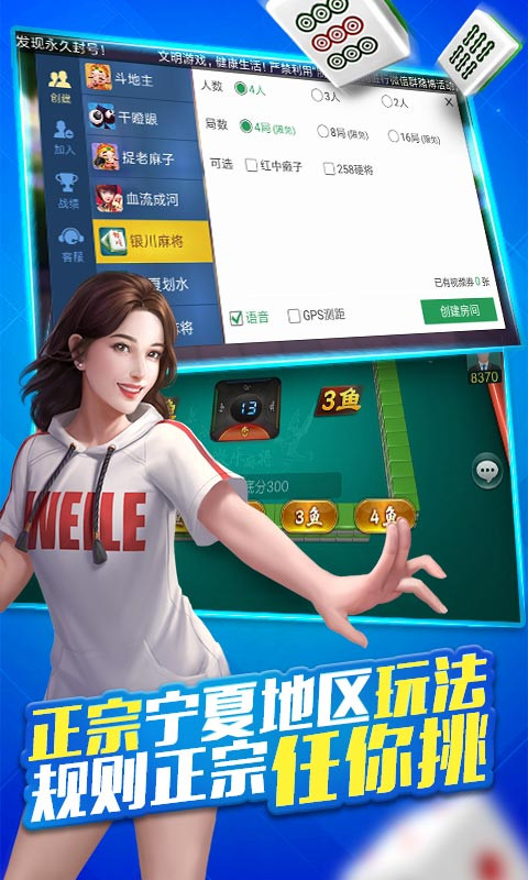 2、 正宗宁夏地区玩法合集,划水麻将、捉鸟麻将、银川麻将、西吉捉鸟麻将、中卫麻将、推倒胡、石嘴山麻将、一口香、吴忠麻将、海原麻将、打报庄、天胡地胡……本地特色玩法应有尽有,规则正宗地道无偏差!
