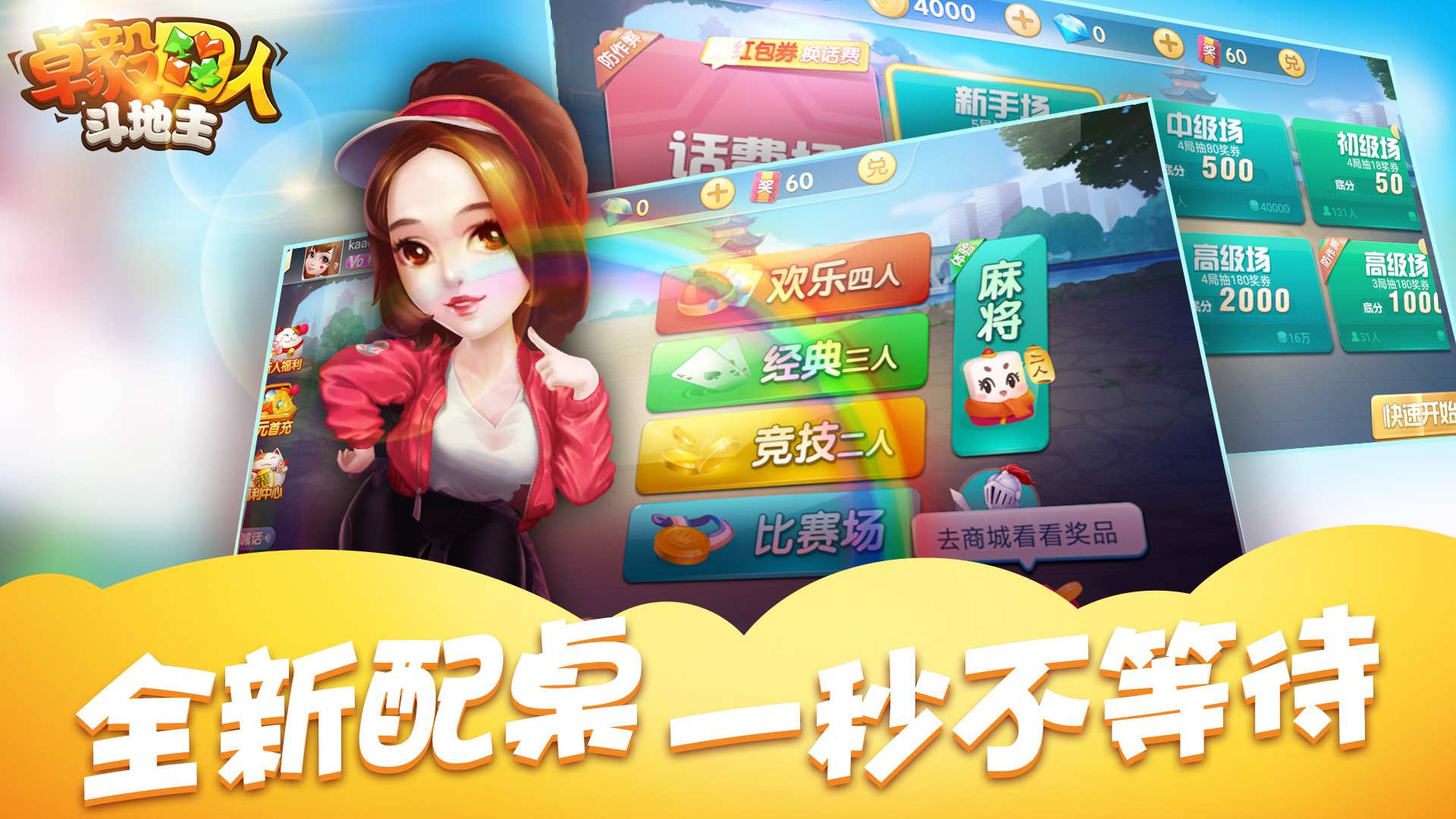 游戏介绍: 画面全新升级,玩法全新组合,四人经典两副牌玩法,欢乐三人斗地主,全新二人竞技斗地主,四人三人二人都可以玩,无需等待,真人实时对战。